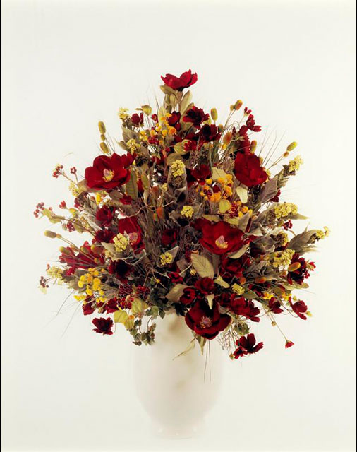 In later years, Shufflebotham’s vases, no longer fashionable for the home, could be found in cemeteries. In The consolation of philosophy: Piko nei te matenga, contemporary artist Michael Parekowhai captures the role of Shufflebotham’s moon-white pottery in memorialising the fallen in cemeteries across the country. The arranged flowers are artificial.