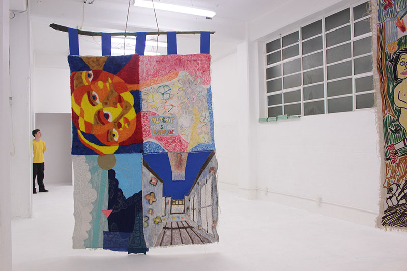 • A large quilt hangs from the ceiling of the play_station gallery. It is an almost empty, white space. Part of another quilt can be seen hanging to the right of the frame