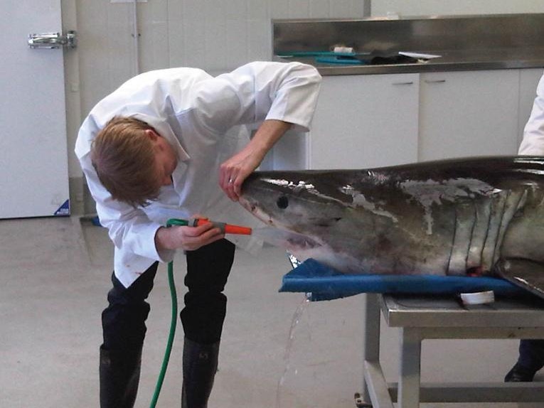 Our fish team picked up a great white shark, an endangered animal and a protected species. The shark had been ensnared in a fishing net and was dead by the time the fishermen had pulled it in, but the team were able to give the specimen a wash and have a closer look.