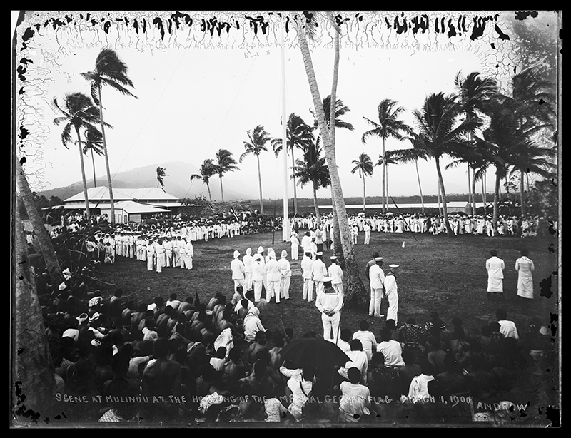 Scene at Mulinu'u Peninsula, Upolu, hoisting the German Imperial flag, 01 March1900, Upolu, by Thomas Andrew. Te Papa (C.001571)