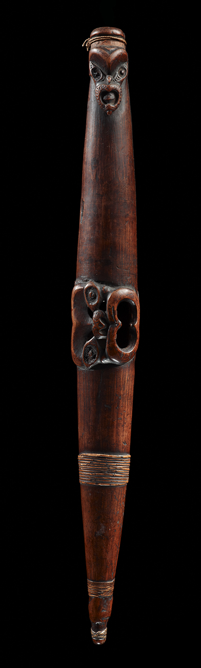 The pūtōrino is shaped like the cocoon of the tūngou ngou. It is said to possess both female and male ‘voices’. Some instruments emit a third voice, said to be a wairua voice. Pūtōrino are made from split and hollowed hardwood, sealed together with natural gums and bound by fine split vines. Listen to the pūtōrino below, or watch the pūrākau about Hine Raukatauri. Hine Raukatauri is the spriitual deity for all Māori flutes. She is a daughter of Tānemahuta.