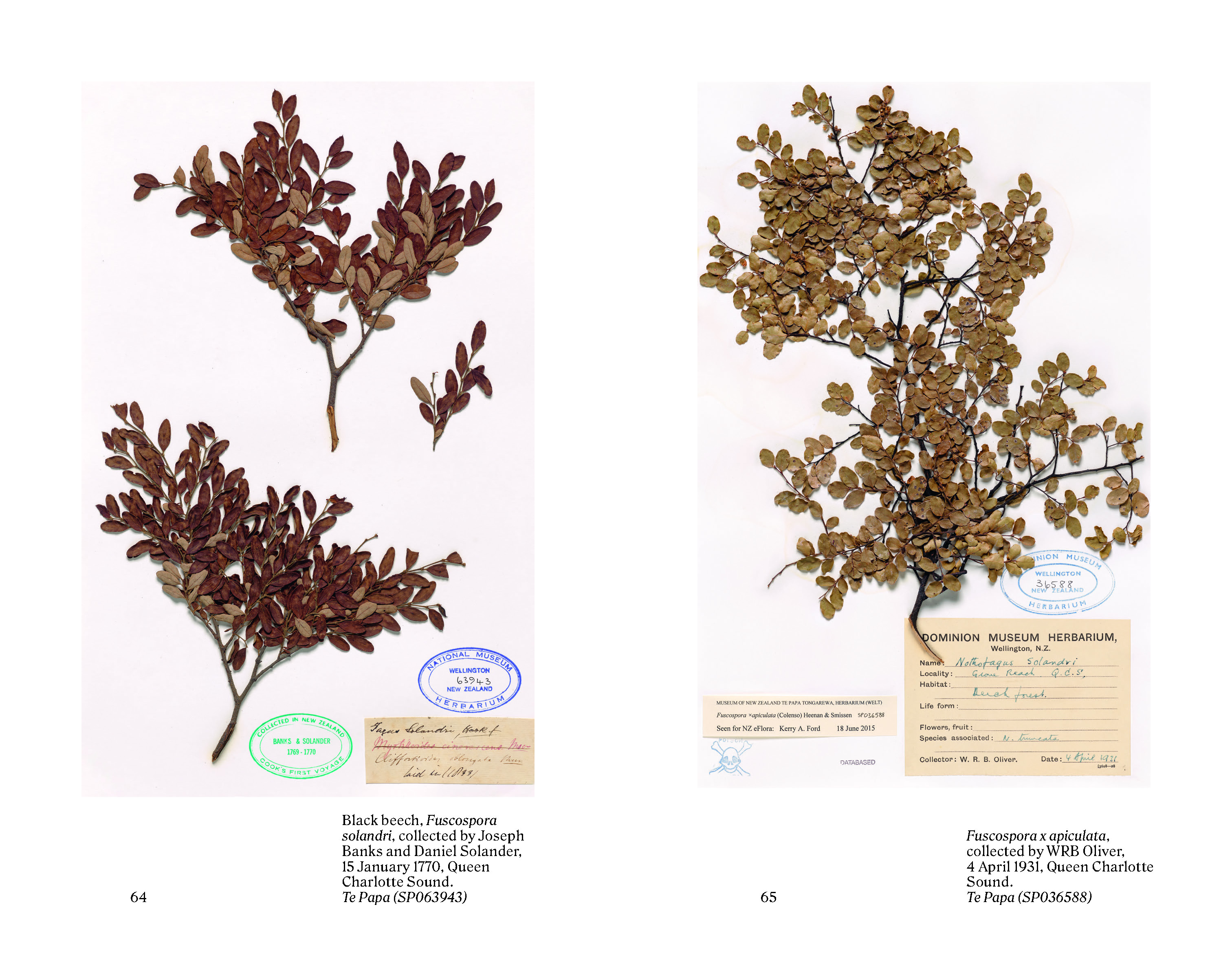 I knew I wanted to include the herbarium as a tree heritage ‘collection’, but I wasn’t prepared for the significant contribution the specimens make towards decision-making regarding conservation as we face climate change. Not only locally but globally as well. The herbarium is bursting with knowledge – as are its curators who were keen to share their information. The photographs included in the book of beech specimens collected in 1770 by Joseph Banks and Daniel Solander, in 1931 by Dominion Museum Director WRB Oliver and by Wellington botanist Eleanor Burton in 2018 demonstrate that although the specimens are dead, the herbarium is very much alive and growing. This is important in the broader context of the book. Heritage is not history itself. It’s what we make of our history, in this case through specimens of trees.